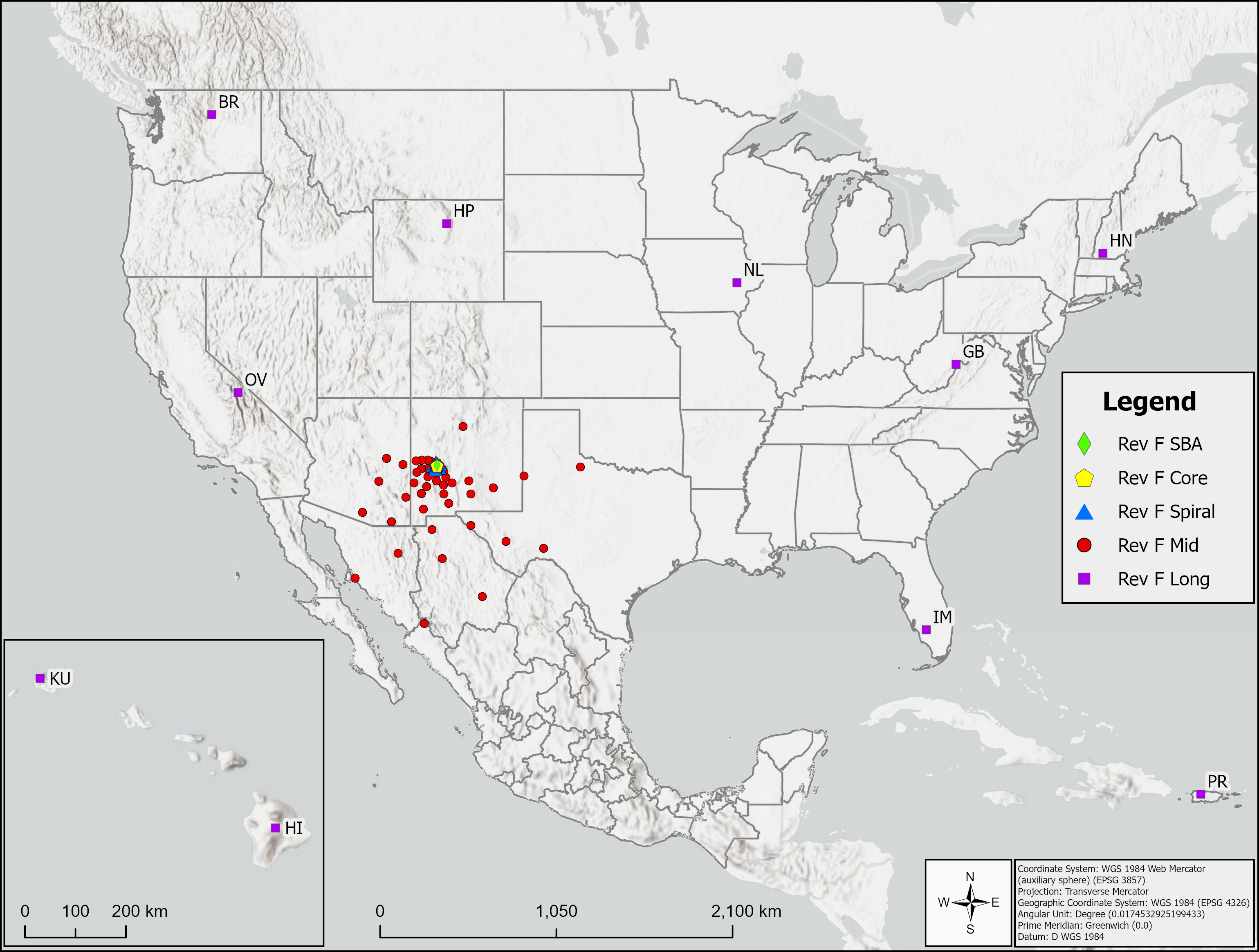 Figure 1: a view of the ngVLA LONG (purple squares) and Mid (red circles) antenna locations for the currently planned configuration (Rev.F).