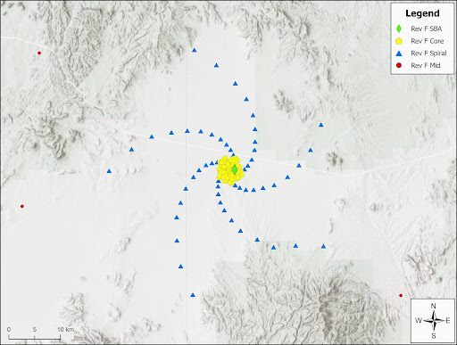 Figure 2: a view of the ngVLA Spiral (blue triangle) and Core (yellow pentagon) antenna locations for the currently planned configuration (Rev.F).