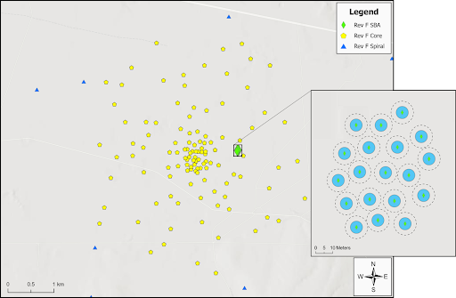 Figure 3: a view of the ngVLA Core (yellow pentagons) and SBA (green diamonds) for the currently planned configuration (Rev.F). The inset figure shows the configuration of the SBA, with blue circles indicating the 6-meter antenna diameter and the dashed lines showing the 11-meter mechanical exclusion zone.