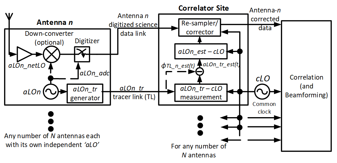 A block diagram of the general operation of the incoherent clocking method is shown in Figure 1. Optional down conversion and digitization of data at each antenna occurs using its own independent LO frequency aLOn(t). Digitized science data is sent to the correlator site along with a digital ‘tracer’ of aLOn(t) on a digital ‘tracer link’ (TL). The TL need only retain the real-time phase/frequency information of aLOn_tr(t) (the tracer frequency) inasmuch as needed to accurately extrapolate to the changing phase/frequency of aLOn_netLO(t) and aLOn_adc(t) that needs correcting in the data. The frequency of the digital tracer is measured and tracked to very high accuracy using a digital tone extractor, as indicated in Figure 2.