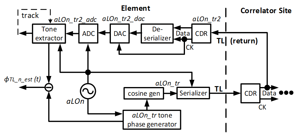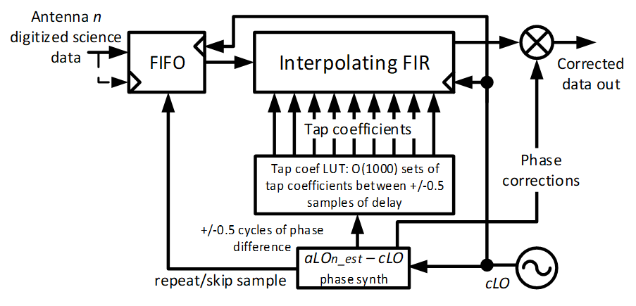 Of course, changes in the tracer link delay, τ_TL(t), for any appreciable TL length has an effect on the measured tracer phase/frequency vs time as indicated in Figure 1. To measure this, of course, a round-trip measurement is necessary: as shown in Figure 3, simply turn around the digital signal and measure its phase/frequency changes relative to the original digital tracer. Use these measurements to adjust the aLOn_tr(t) measurement to obtain a ϕTL_n_est(t)-corrected estimate, aLOn_tr_est(t), of the antenna LO and use it for correcting the data. Once aLOn_est(t) is available, it is used to re-sample and, if necessary, phase-correct the data in the “Re-sampler/corrector” circuit, shown in more detail in Figure 4. This circuit primarily consists of a real-time sample-by-sample interpolating O(80)-tap FIR filter, followed by a mixer to perform any phase corrections needed (for Nyquist zone-1 direct digitization, no phase corrections are required), driven by an aLOn_est- cLO phase synthesizer. What comes out is digital data corrected into the common cLO clock domain, ready for correlation (and beamforming).